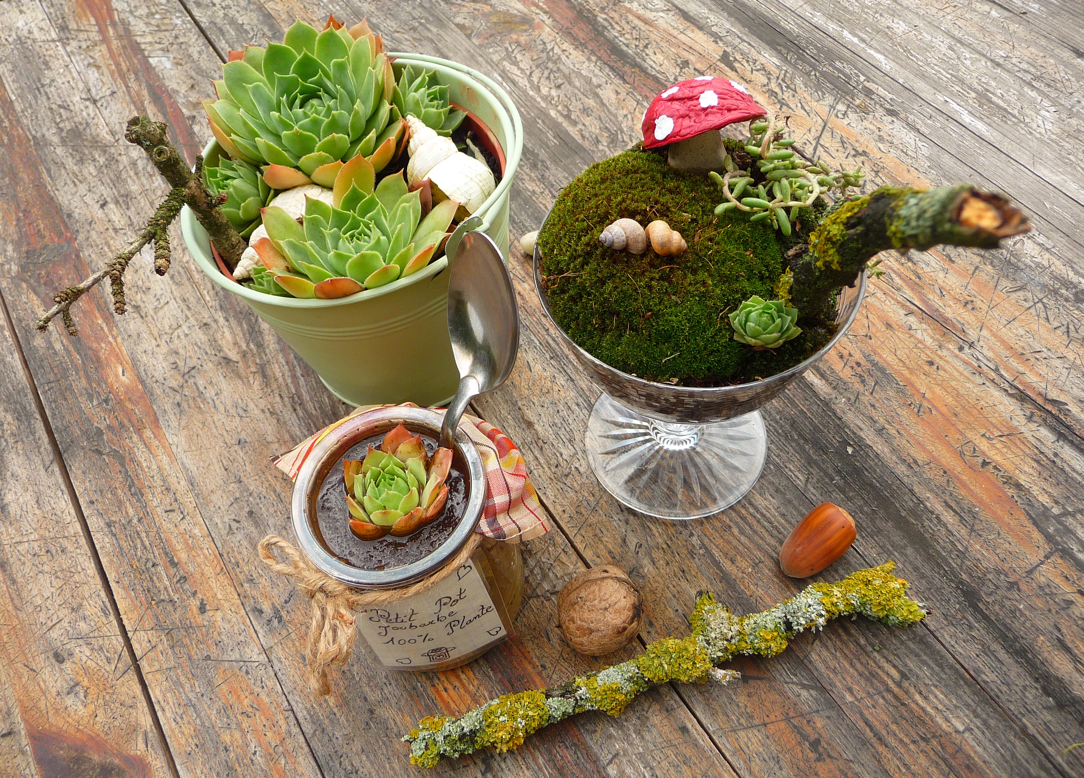 Le petit pot est simple à réaliser : une vielle cuillère, une ficelle autour du pot, une joubarbe au milieu ; dans le coupe à champagne, il y a un gros morceau de mousse bombé (et j’ai découpé des morceaux pour que cela recouvre tout le pot comme un puzzle), une caillou long planté dans la mousse fait le pied du champignon sur lequel est posé la coquille de noix peinte à l’acrylique.