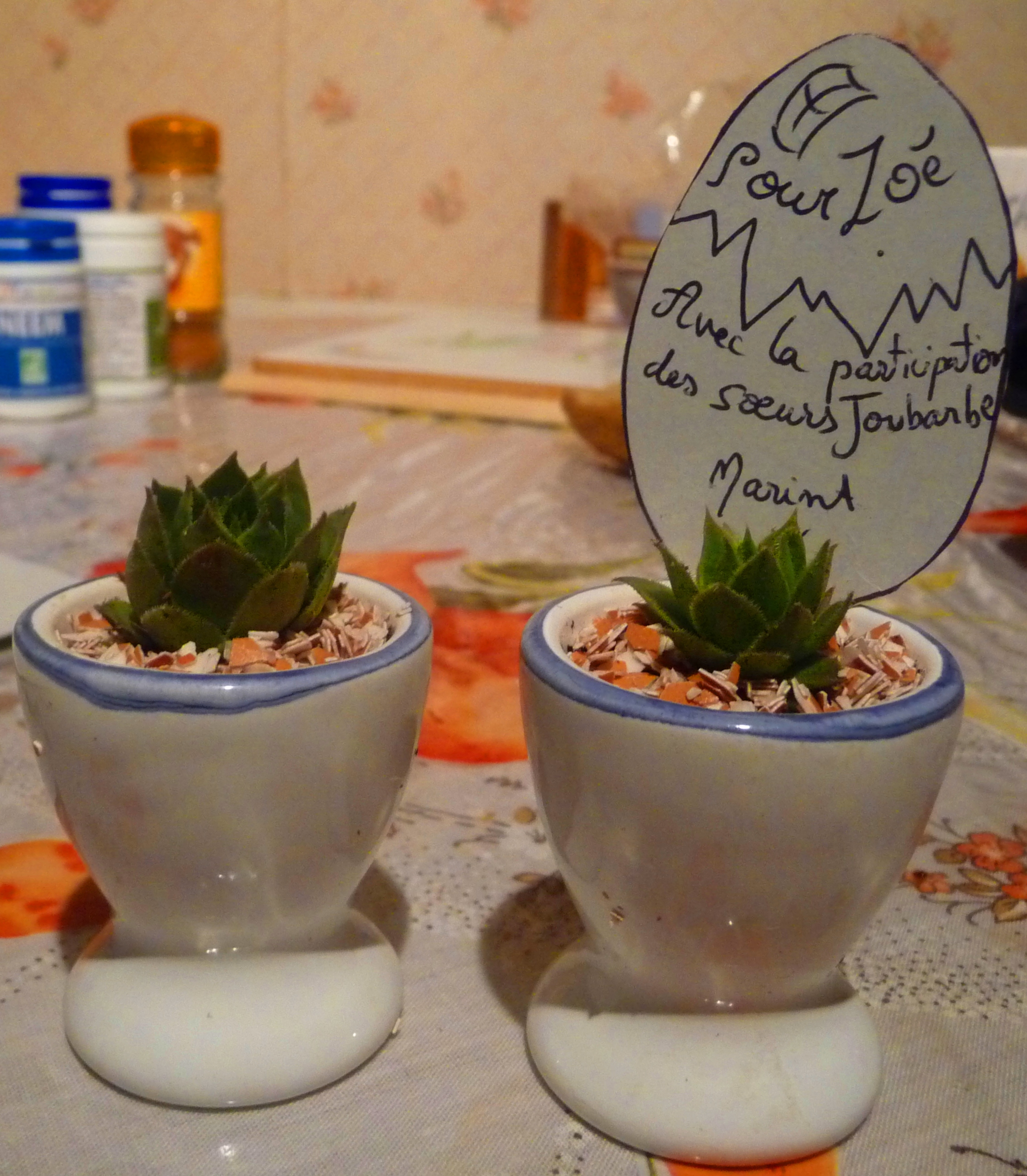 Très sympas pour les décos de table : des minis coquetiers avec des joubarbes. Des coquilles d’œufs coupées en petits bouts à la main ont été placés en dessus.