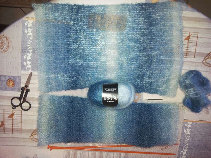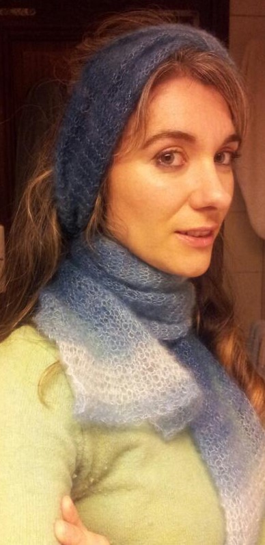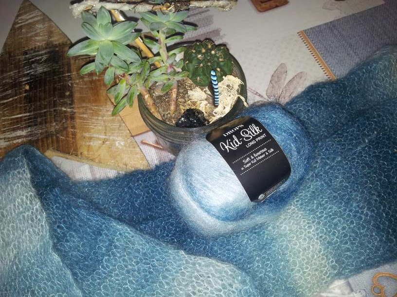 Super idée de cadeau : une amie m’a offert deux pelotes de laine mohair et soie dégradé de bleu-vert et blanc : magnifique et chaud !