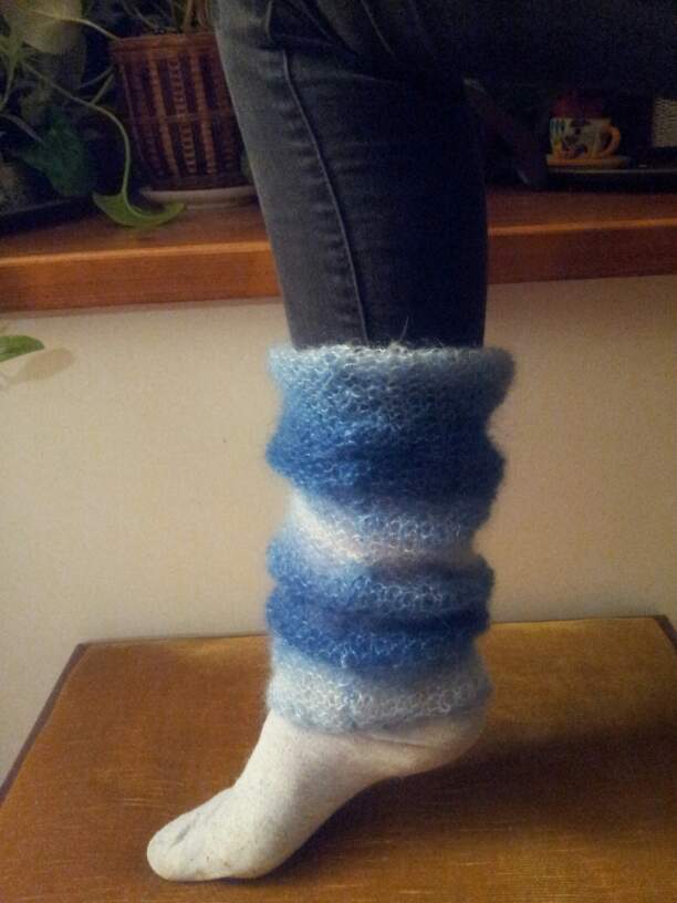 Pour les guêtres, monter 40 mailles pour un taille 36, et tricoter lâche les derniers rangs. Puis coudre bord à bord avec une aiguilles à laine pour bien respecter les lignes du dégradé. Penser à commencer par les mêmes couleurs pour faire deux guêtres identiques.