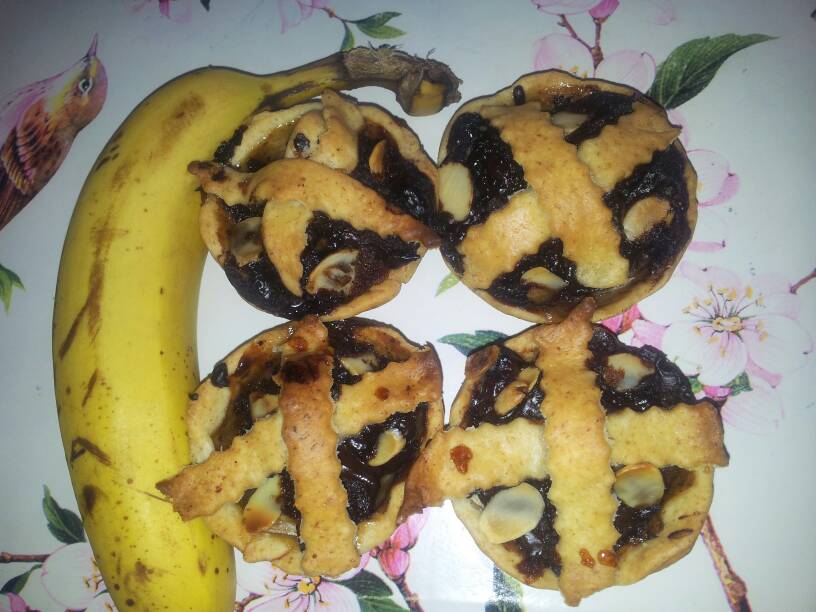 Mon choix : une pincée de sucre de canne (et aucun dans certaines tartelettes), des rondelles de banane, puis du chocolat noir fondu, des amandes effilées.