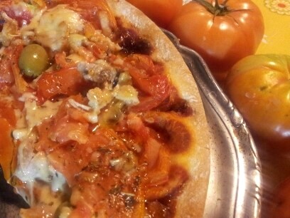 Ici, j’ai ajouté sur une pizza toute prête : des tranches de tomates, des olives, un reste de poulet. Un filet d’huile d’olives et au four^^