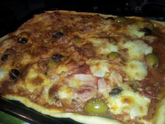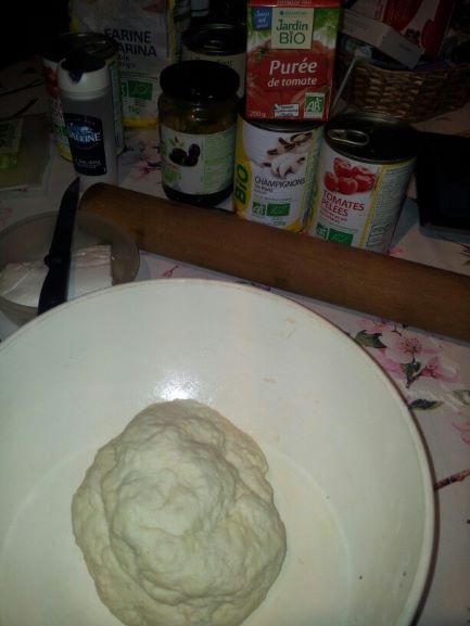 Ici, j’ai tout fait : la pâte puis la pizza au jambon et fromage mozzarella :