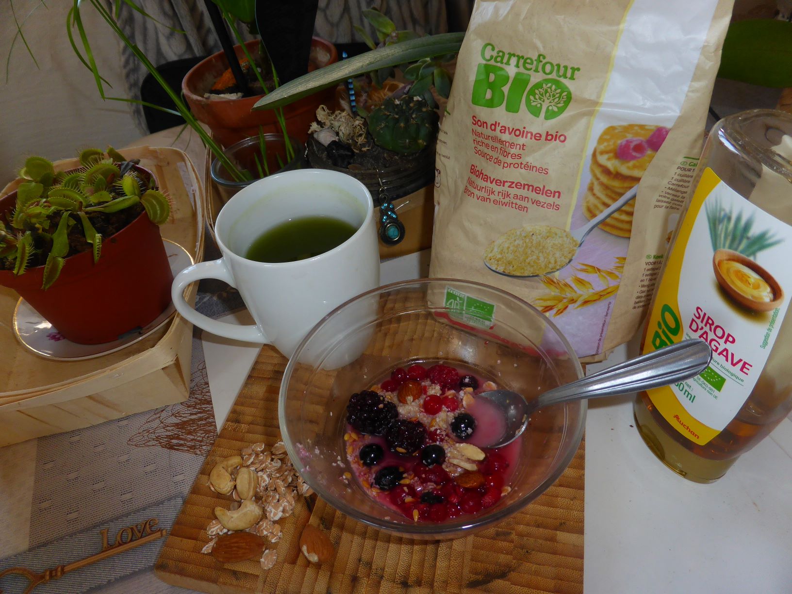 J’ai mélangé dans un bol du son d’avoine (fibres), des flocons (Vit B, minéraux), quelques graines de lin (oméga 3), amandes et noix de cajou (potassium), et j’ai ajouté des fruits rouges congelés (antioxydants, Vit C) Ici ce sont des Leader Price et la qualité est bonne, mais l’idéal reste du frais bio.