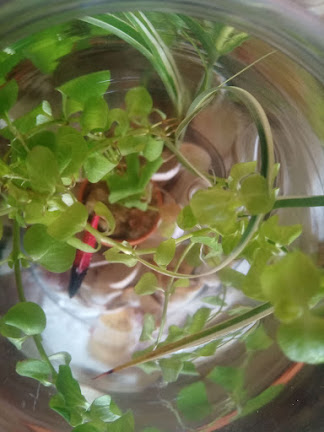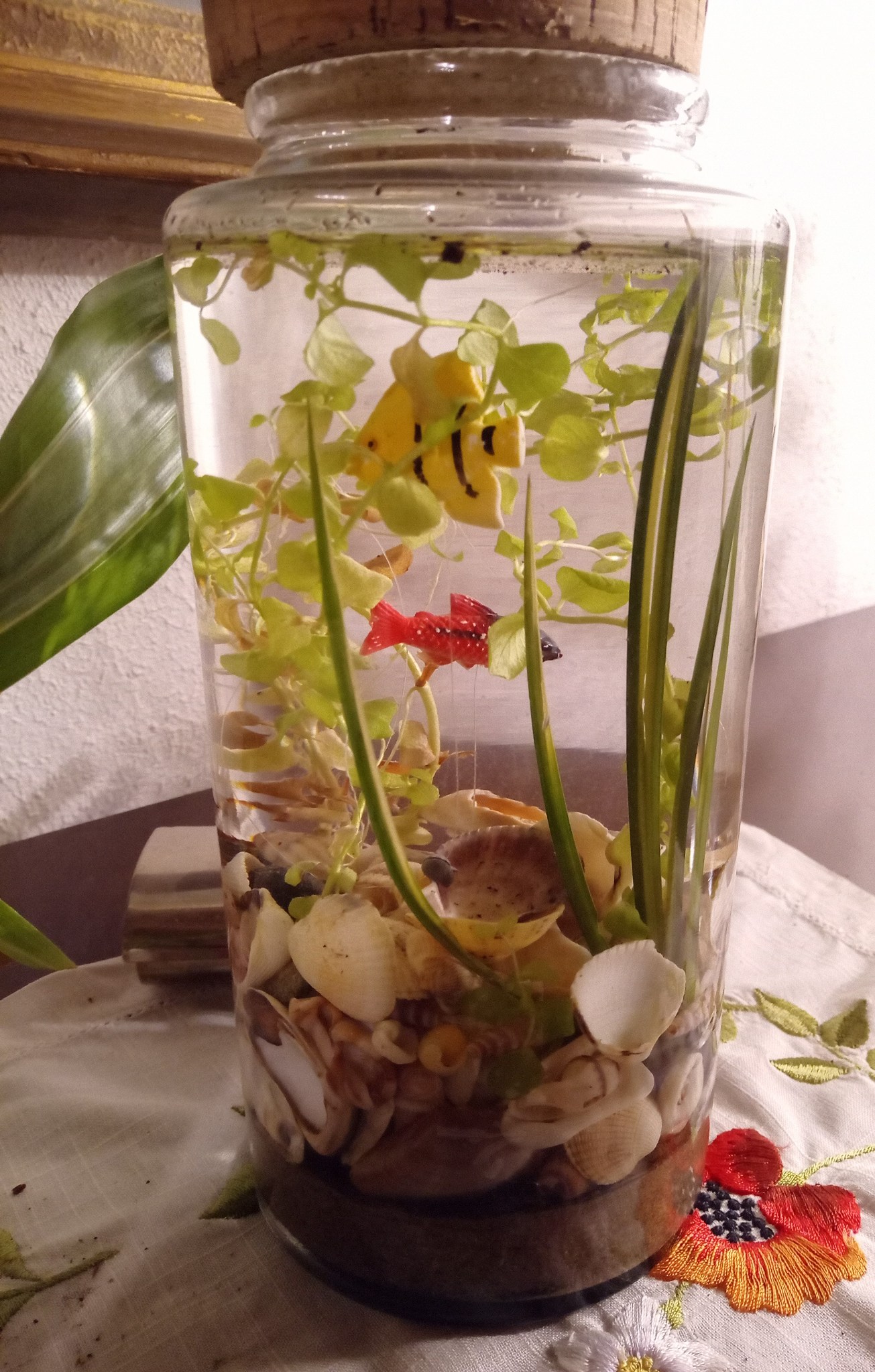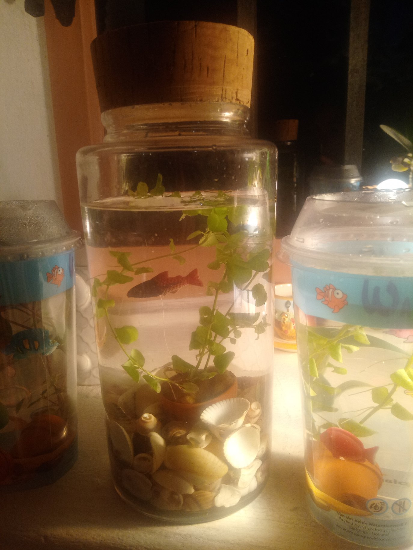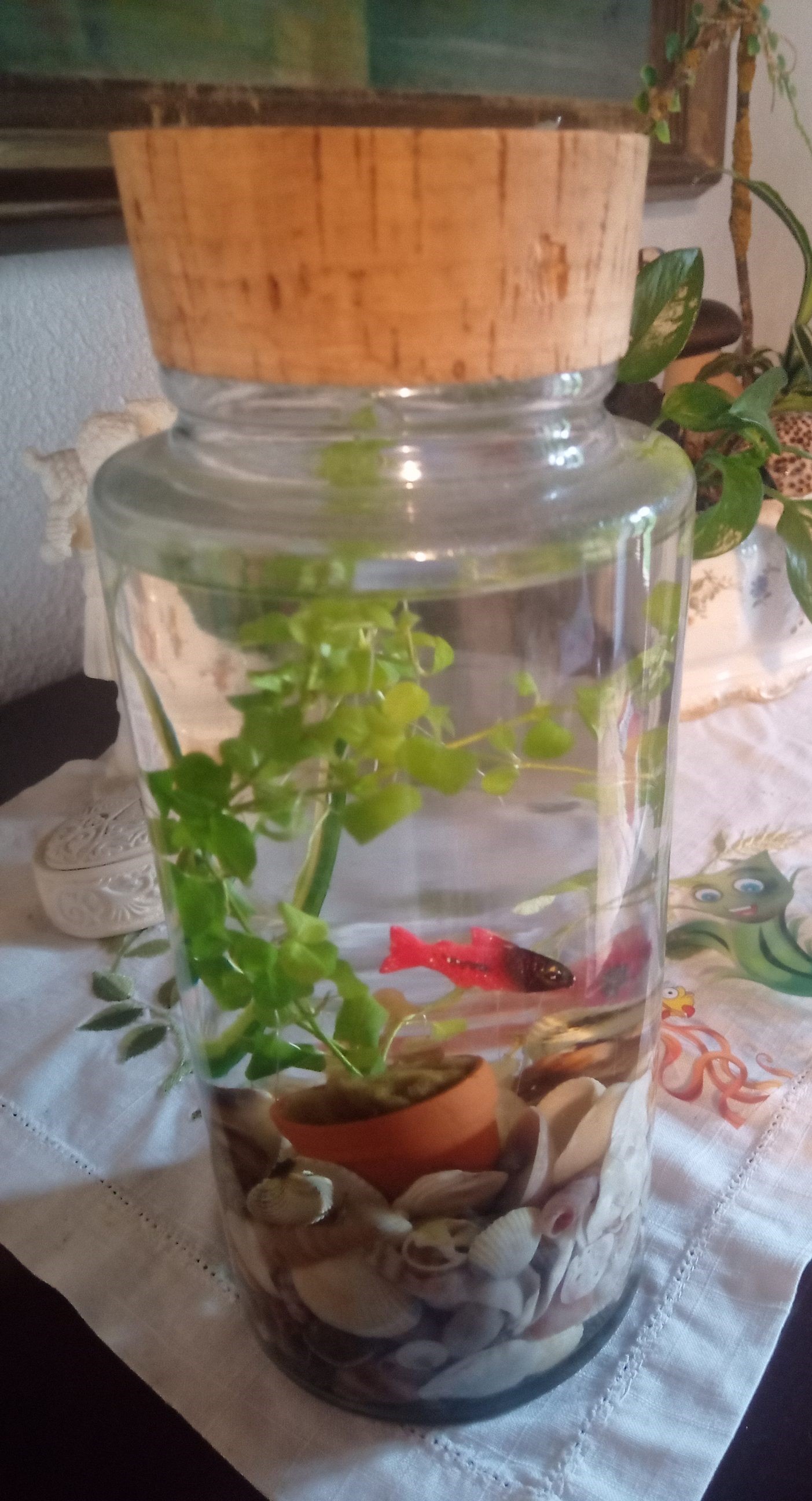 Acheté 2€ en supermarché, ce pot (en plastique) contient une plante aquatique avec un poisson en plastique ! Voilà une idée cadeau qui émerveillera tous les âges. Très chouette dans un bocal en verre avec bouchon en liège ! Et pourquoi pas une idée de cadeau pour Noël ?