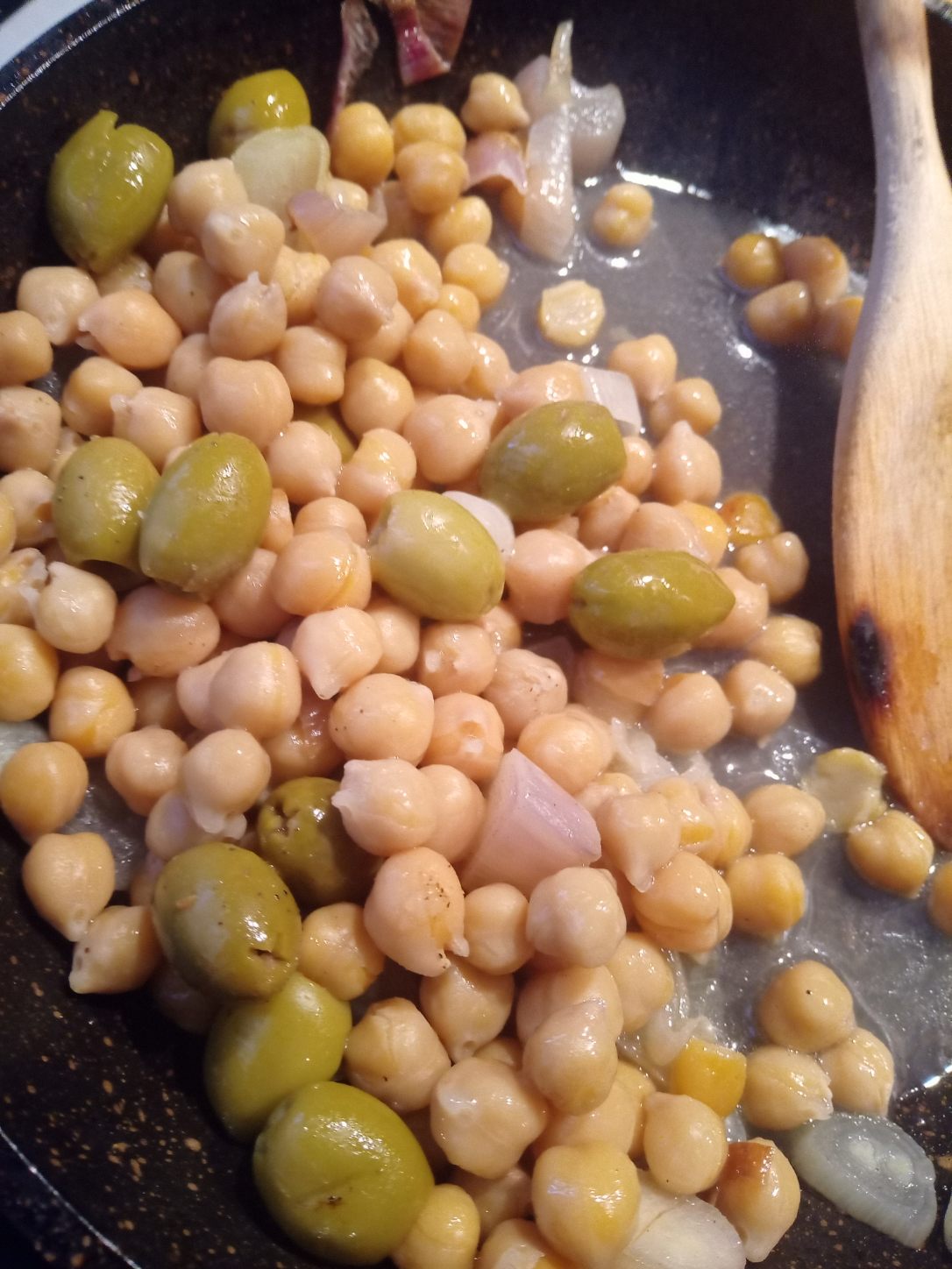 Je fais revenir des oignons dans une poêle, j’ajoute la boîte de pois chiche puis des olives vertes. Un brin de sel et poivre.