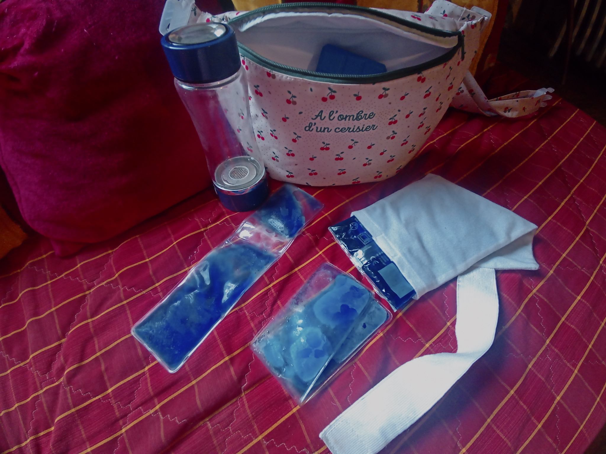 Les gros packs peuvent être mis dans une banane, isotherme comme j’ai (acheté sur Vinted) ou dans un tissus contre la jambe au coucher.