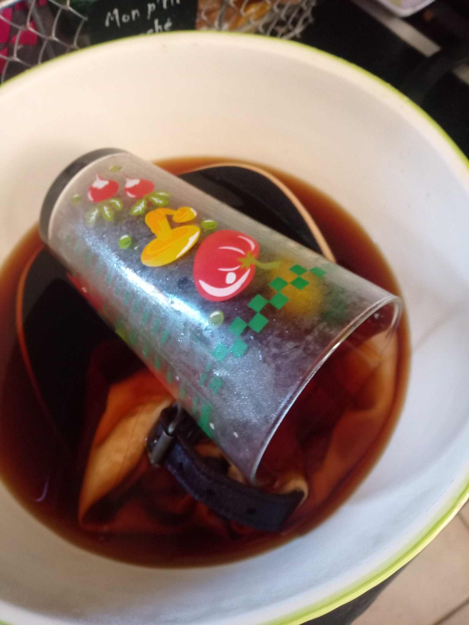 j’ai préparé dans un saladier, 1l d’eau bouillante et 2 cuillères à soupe de thé noir (ou 5 sachets) avec couvercle