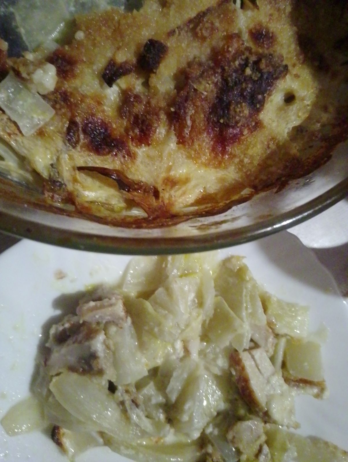 Endives coupées en petits bouts, bouts de poulet-lardon (ou tofu fumé), sel, un fond de crème avec du lait (végétal ou pas), parmesan, panure, huile en filet dessus.