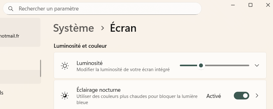 Il y a 9 heures 13 février 20265 février 2026Less is More Écran d’ordinateur avec moins de lumière bleue Un éclairage moins agressif de l’écran est possible : Démarrer, Système, écran et j’ai réglé la luminosité et la lumière bleue. Partager :TweetJ’aime chargement… Similaire